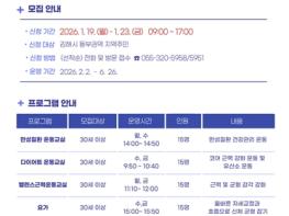 [헬스앤마켓리포터스, 조태익기자] 김해시 동부건강생활지원센터는 지역주민의 만성질환예방 및 건강증진을 위해 19일부터 1월 23일까지 '26년 상반기 운동교실' 참여자를 모집한다고 밝혔다.