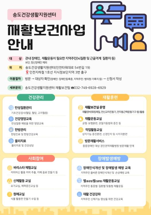 재활보건실은 평일 9시에서 17시까지 운영하며, 자세한 사항은 송도건강생활지원센터 재활보건팀으로 문의하면 된다.