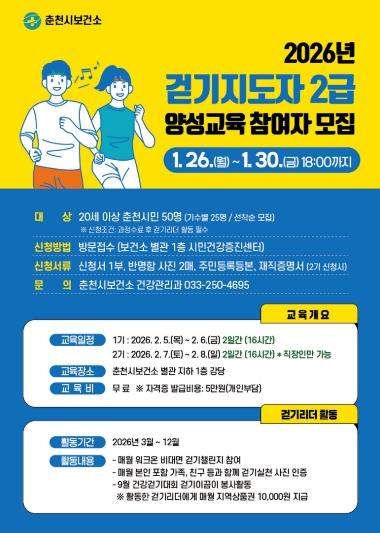 [헬스앤마켓리포터스, 조태익기자] 춘천시보건소가 시민의 걷기 실천 역량을 높이고 지역사회 중심의 걷기문화를 확산하기 위해 ‘2026년 걷기지도자 2급 양성 교육’ 참여자를 모집한다.