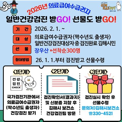 [헬스앤마켓리포터스, 조태익기자] 김해시보건소는 2026년 새해를 맞아 의료 취약계층의 질병을 조기에 발견하고 예방하기 위해 의료급여수급권자를 대상으로 『일반건강검진 받GO! 선물도 받GO!』 이벤트를 실시한다고 밝혔다.