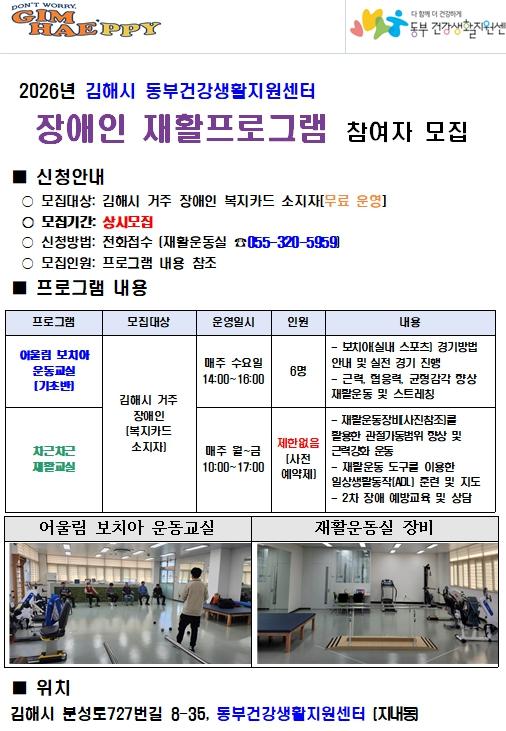 재활프로그램 관련 문의는 김해시 동부건강생활지원센터 재활운동실로 하면 된다.