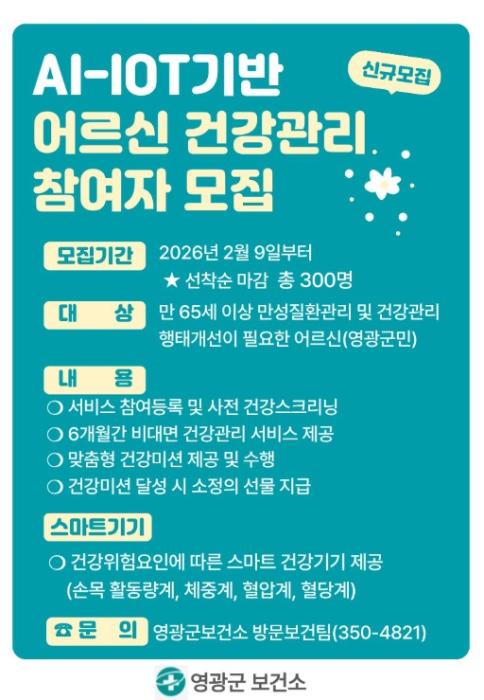 [헬스앤마켓리포터스, 조태익기자] 영광군은 초고령화 시대에 대비해 65세 이상 영광군민을 대상으로 AI・IoT(인공지능사물인터넷)기반 어르신 건강관리사업 신규 참여자 300명을 2월 9일부터 선착순 모집한다고 밝혔다.