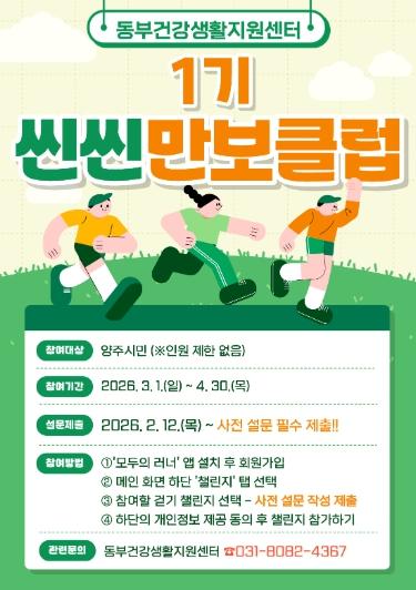 [헬스앤마켓리포터스, 조태익기자] 양주시보건소 동부 건강생활지원센터에서는 지역 주민의 건강생활실천율 향상 및 비만율 개선을 위해 2026년도 ‘씬씬 만보클럽’ 1기 참여자를 모집한다.