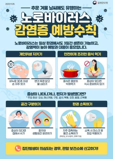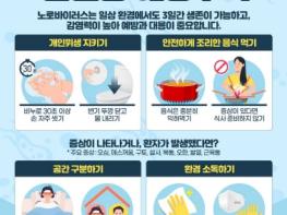 특히, 노로바이러스 감염증은 감염력이 강해 설 명절을 전후하여 가족·친지가 함께 모여 음식을 섭취하는 경우 집단 발생 위험이 커진다. 발병 시, 음식 섭취 후 12~48시간 이내에 오심, 구토, 설사, 복통 등을 동반한 2가지 이상의 증상이 발생하며, 이러한 증상이 72시간 이상 지속되면 탈수 증상이 주 합병증으로 나타난다.