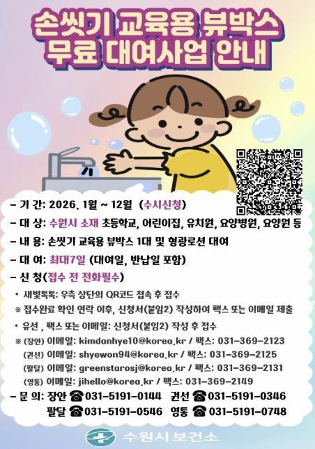 [헬스앤마켓리포터스, 조태익기자] 수원시보건소가 교육용 손씻기 체험 기구인 ‘뷰박스(View-box)’를 무료로 대여한다.