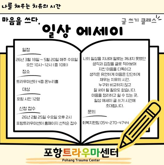 [헬스앤마켓리포터스, 조태익기자] 포항시 북구보건소 트라우마센터는 문학 치유 프로그램인 ‘2026년 마음을 쓰다: 일상 에세이’ 글 쓰기 참여자를 모집한다.