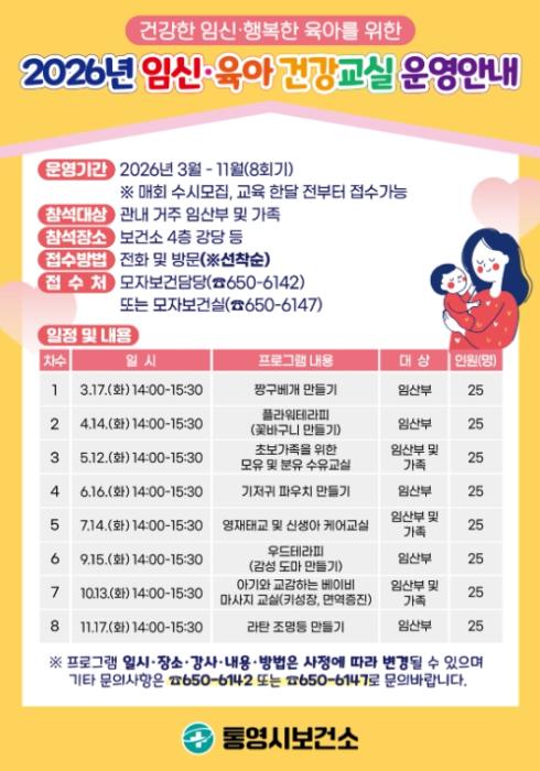 [헬스앤마켓리포터스, 조태익기자] 통영시는 임산부와 예비부모의 초보육아의 어려움을 덜어 주고 안 정적인 태교 지원을 위해 2026년 3월부터 11월까지 매월 통영시보건소에서'임신·육아 건강교실'을 운영한다고 13일 밝혔다.