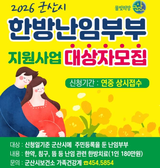 [헬스앤마켓리포터스, 조태익기자] 군산시보건소는 난임으로 어려움을 겪고 있는 부부의 경제적 부담을 완화하고 건강한 임신과 출산을 지원하기 위해 ‘한방 난임부부 지원사업’ 참여자를 모집한다.