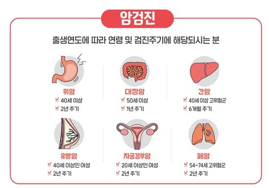검진 대상과 주기는 ▲위암(40세 이상, 2년 주기) ▲대장암(50세 이상, 매년) ▲간암(40세 이상 고위험군, 6개월 주기) ▲유방암(40세 이상 여성, 2년 주기) ▲자궁경부암(20세 이상 여성, 2년 주기) ▲폐암(고위험군 대상) 등이다.