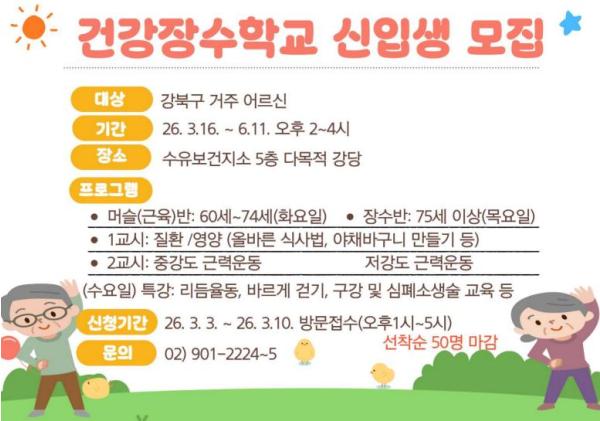 [헬스앤마켓리포터스, 조태익기자] 서울 강북구는 어르신들의 활기찬 노후 생활을 지원하고 만성질환 예방을 돕기 위해 오는 16일부터 ‘건강장수학교’를 운영한다고 밝혔다.