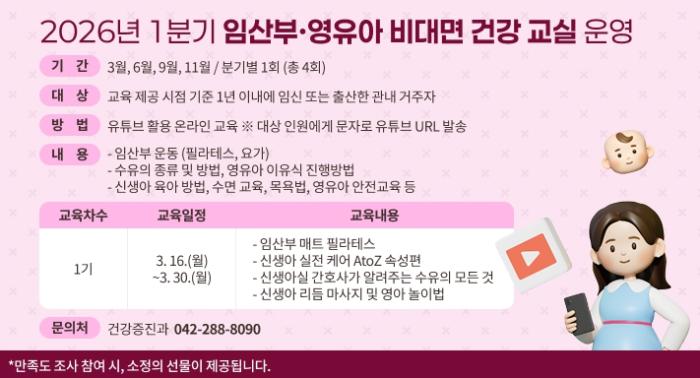 [헬스앤마켓리포터스, 조태익기자] 대전 중구는 오는 16일을 시작으로 6월, 9월, 11월 등 총 4회에 걸쳐 임산부·영유아 비대면 건강교실을 운영한다고 밝혔다.