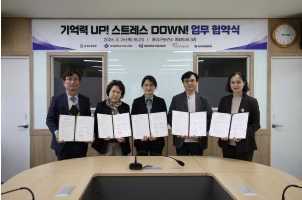 [헬스앤마켓리포터스, 조태익기자] 홍성군은 지난 26일 청운대학교 RISE사업단, 혜전대학교 RISE사업단, 홍성사회복지관, 홍성군자원봉사센터와 함께 ‘기억력 UP! 스트레스 DOWN!’ 사업 추진을 위한 업무협약을 체결했다고 밝혔다.